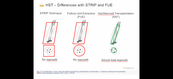 Nella HST, HairStemcell Transplantation®, viene utilizzato un ago da 0,5 a 0,6 mm per estrarre solo una minima porzione di tessuto capillare. Questo prelievo parziale di tessuto contiene una quantità di cellule staminali dei capelli sufficiente per produrre un nuovo capello. Se viene lasciata una porzione del follicolo nell’area donatrice dopo un’estrazione parziale, essa rigenera un nuovo capello. A sua volta anche la porzione che è stata rimossa produrrà un capello quando trapiantata nell’area ricevente. Applicando la tecnica HST, un solo follicolo pilifero è in grado di produrre più capelli come descritto e pubblicato nella rivista scientifica British Journal of Dermatology.