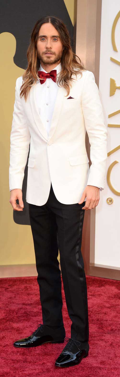 Jared Leto è stato uno dei protagonisti nella notte degli Oscar. Attore e musicista, ha vinto la preziosa statuetta come miglior attore non protagonista nel film “Dallas Buyers Club” (anche il collega Matthew McCounaghey è stato premiato per la sua intepretazione). Sul red carpet, Jared Leto si è presentato vestito in modo elegante ma non convenzionale, proprio come si addice al suo stile: il total look firmato Hedi Slimane per Saint Laurent era spezzato, giacca bianca e pantaloni neri.