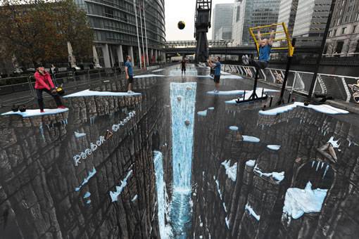 Questo dipinto unico si avvale della tecnica della ‘street art anamorfica’, resterà esposto per alcuni giorni lungo il Canary Wharf di Londra, nel West India Quays e diventerà un ambiente divertente ed interattivo in 3D dove le persone saranno incoraggiate ad allenarsi e provare i movimenti funzionali di Crossfit. Sembrerà loro di essere appesi sopra un precipizio o in piedi all’angolo di un burrone. Per rivivere questa esperienza da record, i partecipanti saranno invitati a taggarsi e condividere il loro allenamento in 3D su www.facebook.com/reebok.