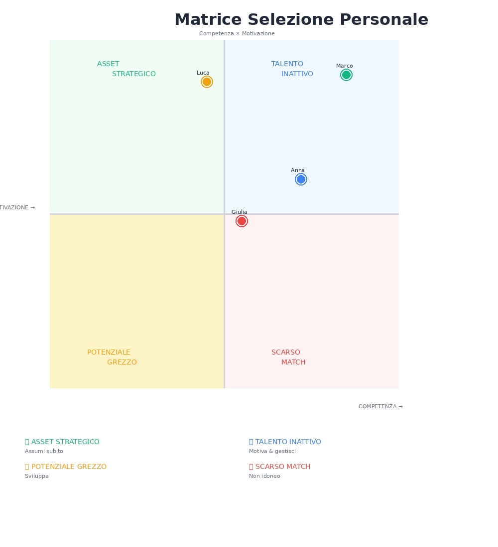 La bellezza della matrice Competenza-Motivazione risiede nella sua semplicità e nella chiarezza con cui suddivide i candidati. Comprendere questi quattro profili è essenziale per implementare efficacemente il processo di selezione: