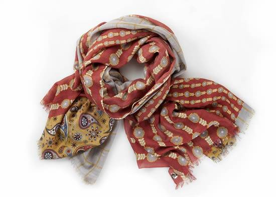 Kefieh offre una serie di scelte rigorosamente quadrate sviluppate a partire dai disegni cashmere e dai fiori sfumati al limite dell’indefinito, che spiccano su sfondi a stampa effetto pizzo. Da segnalare la variante con cuoricini in metallo e frange che, una volta indossata, si evolve in una vera e propria maxi-collana che un po’ accarezza e un po’ incornicia viso e collo.