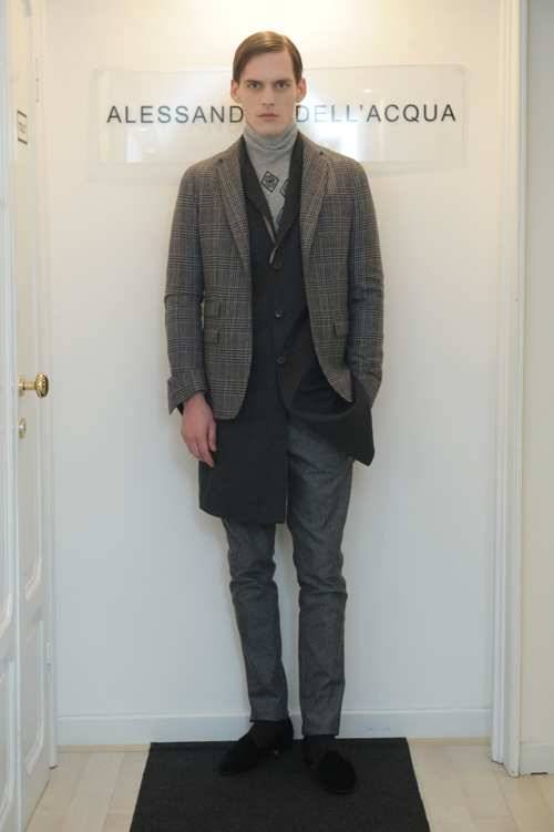 La collezione Autunno/Inverno 2013-14 ALESSANDRO DELL’ACQUA UOMO propone una silhouette “aggiornata” fatta di volumi morbidi, di materiali preziosi e decori dal forte impatto grafico. Il tema della collezione, “Le strade del sogno”, racconta un viaggio attraverso sei metropoli della moda internazionale: New York, Londra, Parigi, Milano, Mosca, Shanghai.