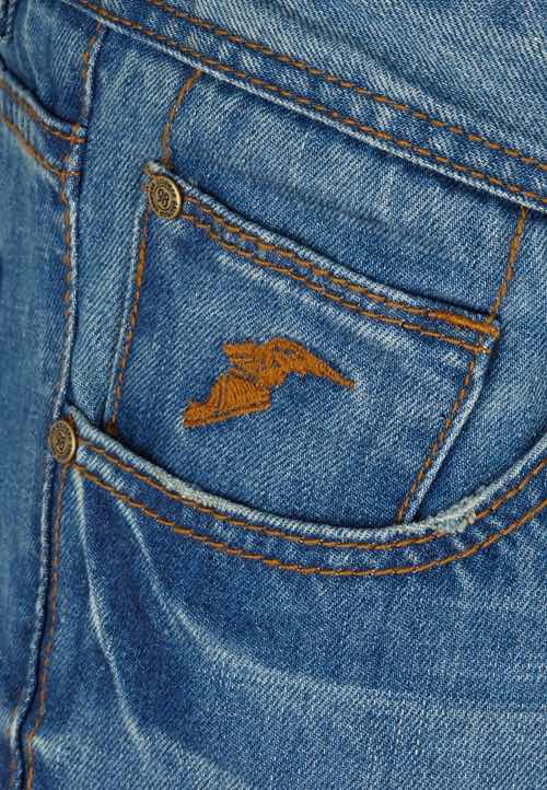 Plus della collezione denim di Goodyear sono i lavaggi che conferiscono ai capi una colorazione dal chiaro allo scuro con effetti délavé donandogli uno stile decisamente autentico. La linea, inoltre, si arricchisce di una giacca dallo stile collegiale che unisce al corpo in denim le maniche in nylon e dove ritorna il logo stampato su una originale etichetta in pelle.