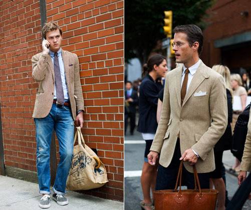 Come vedete, una giacca blu, su camicia bianca e pantalone di cotone beige funziona, donando a chi lo indossa un effetto pop notevole. Mescolare altri tipi di accessori e scarpe in tonalità viola, gialle o verdi, vi consentirà di dare maggiore personalità al vostro abito. Fidatevi di jeans e t-shirt per un look casual, e se proprio volete sbizzarrirvi potete anche puntare su un denim più colorato di altri (blu, rosa, giallo). Ricordatevi che se la giacca dell’abito è marrone i jeans devono essere bianchi.
