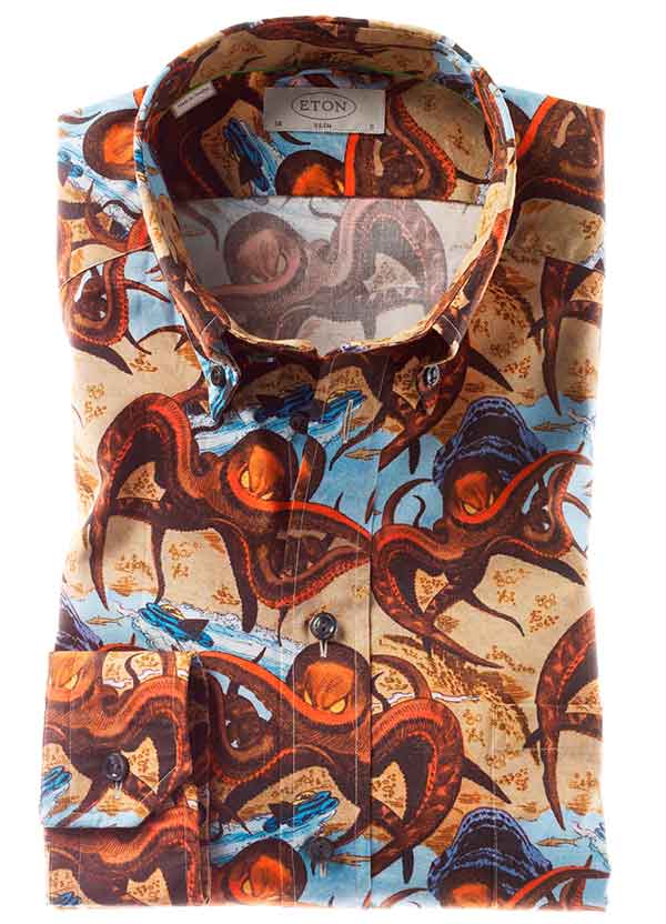Polpi irriverenti e misteriosi fanno capolino sul capo più classico dell’heritage di Eton trasformandolo in un “must have” per l’estate 2014. La camicia secondo Eton è un mix di creatività grafica e versatilità, in cui gli accostamenti di colore pieno amplificano i codici dell’eleganza e rinnovano il cotè classico del guardaroba maschile con un tocco strong e inedito.