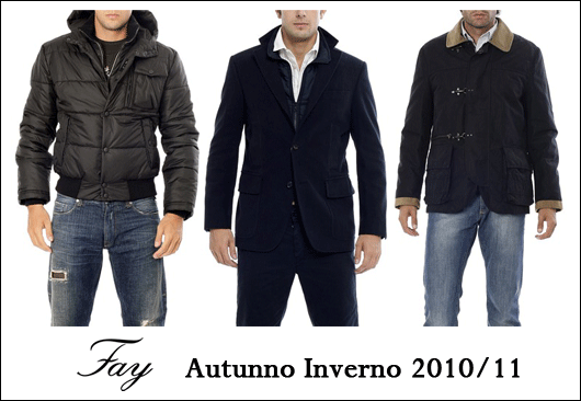 Numerosi sono i modelli tra cui potere scegliere nella collezione Fay autunno inverno 2010/11: giubbotti e piumini in nylon trapuntato lucido o opaco, eleganti cappotti e giacche in lana, jersey e velluto, dalle classiche tonalità invernali, nero, blu, grigio, ma anche sferzate di colore, come il viola e il color cammello, trend di questo autunno-inverno.