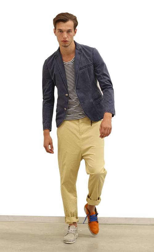denim, sabbiate per ottenere un particolare effetto vissuto. La palette cromatica è intensa e vivace, dal bluette al rosso fuoco, passando dal giallo al verde: un’esplosione di colori che sottolinea l’approccio moderno di Daniele Alessandrini all’estetica maschile. Capo icona è la giacca a tre bottoni con maniche in lino, corta e dal fit asciutto, declinata in un vibrante bluette con bordature in tono e