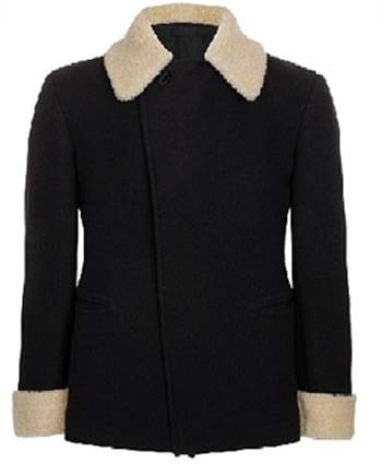Il colore è blu navy, ci sono innesti in pelle di pecora e la chiusura asimmetrica spezza la monotonia del capo.
