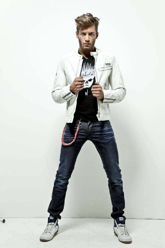 Globetrotter, rocker, dandy, sportivo: l’uomo ENERGIE, originale ed eclettico, per la prossima Primavera/Estate 2012 vive il proprio stile in una metamorfosi costante, alla riscoperta di sé e delle sue passioni. Il parka più casual, destrutturato e morbido sul corpo, si affianca così al chiodo extraslim dall’anima rock, che trova espressione negli effetti handmade, studiati per dare risalto ai dettagli e ai profili metallici, e nel motivo bandana che ritorna su t-shirt e accessori.