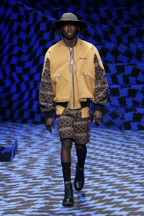 Distorsione è la parola d’ordine per l’a/i 20/21. Fiori deformati – creati da Mirko Borsche – motivi folk, motivi pied-de-poule allover liquefatti creano effetti psichedelici su bomber, maglioni jacquard, camicie, anorak imbottiti, felpe e short. Anche il modo in cui tasche e i dettagli vengono applicati sui pezzi è distorto, mentre cuciture a contrasto creano un altro livello di distorsione. I piumini riflettenti, le giacche monopetto e i bomber ricoperti di cristalli Swarovski sono pensati per sfolgorare e abbagliare. La palette dei colori è una fusione di pietra, marrone, muschio, sesamo, nero illuminati da un blu abbagliante e stampe colorate.