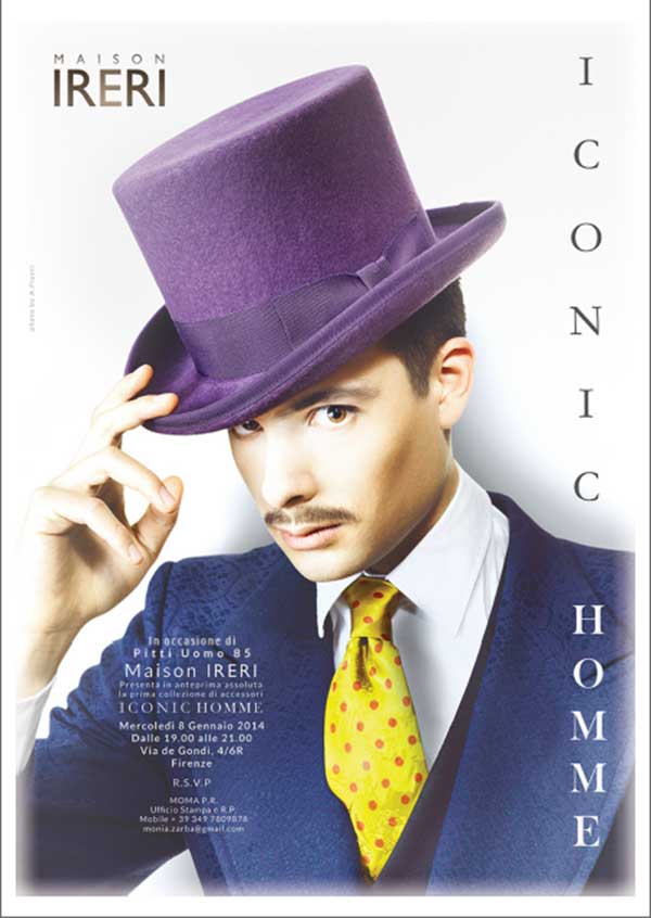 ICONIC HOMME sarà in mostra da mercoledì 8 gennaio 2014, dalle ore 19 alle ore 21 presso l’atelier Maison Ireri in via de Gondi, 4/6R, Firenze.