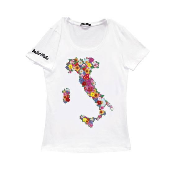 Una stampa davvero originale: piccoli fiori multicolori come gerbere, primule, viole e gigli, impreziositi da SWAROVSKI ELEMENTS, si accostano fino a comporre la forma del famoso stivale, isole comprese! Per il secondo anno consecutivo, la storica emittente nazionale di sola musica italiana ha commissionato al brand EAN 13 la produzione delle t-shirt, assolutamente made in Italy, che riportano il logo della radio unitamente a quello del brand.