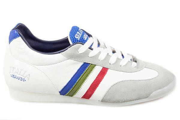 In occasione dei mondiali di calcio Serafini presenta la sneaker “Italia”. Pelle e camoscio, bande laterali nei colori verde bianco e rosso della bandiera italiana e il ricamo “Italia” laterale. Uomo e donna. Made In Italy.