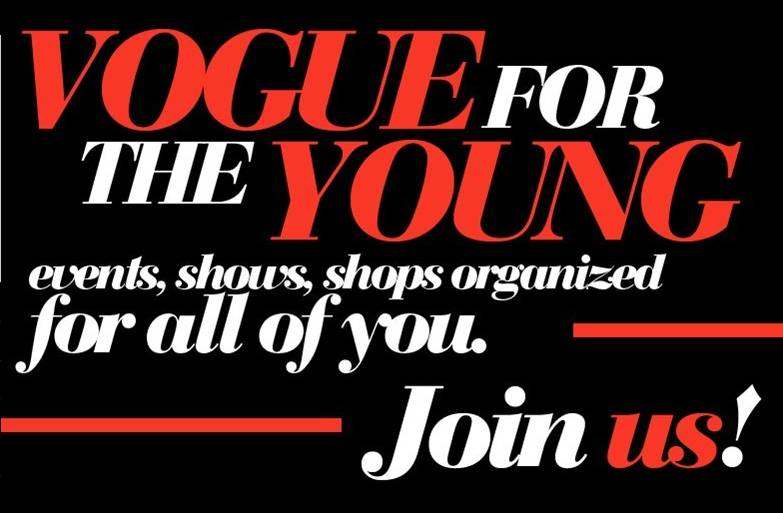La ricerca di nuovi talenti è di grande importanza per Vogue Italia e, per poter offrire un aggiornamento costante su tutto ciò che succederà nel corso della settimana della moda, il prestigioso mensile inaugura la nuova sezione all’interno del sito Vogue.it: Vogue per i giovani. Sarà possibile scoprire, giorno per giorno, come partecipare a eventi, inaugurazioni e fashion show aperti al pubblico, per conoscere i designer del futuro e le novità della prossima stagione.Fare in modo che Milano mantenga il suo primato di capitale della moda: è questo l’impegno che vede Vogue Italia e il Comune di Milano coinvolti attivamente nell’organizzazione di eventi, mostre e sfilate aperte al pubblico in cui i protagonisti saranno esclusivamente i giovani.