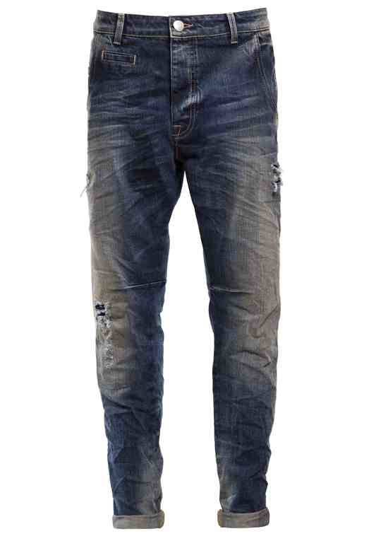 Pantalone loose, vestibilità confortevole, vita regolare, cavallo basso e gamba comoda che stringe al fondo. Entrata tasche davanti molto accentuata. taschino inserito nel fianco con chiusura con bottone a chiodo. Dietro senza carrè, particolare attenzione alla costruzione del dietro con pinces posizionate all’altezza del bacino e tasche applicate molto basse. Lavaggio medio, con baffi, graffiature laterali, rotture con toppe, dirty ed affetto stropicciato. Cuciture color tabacco.