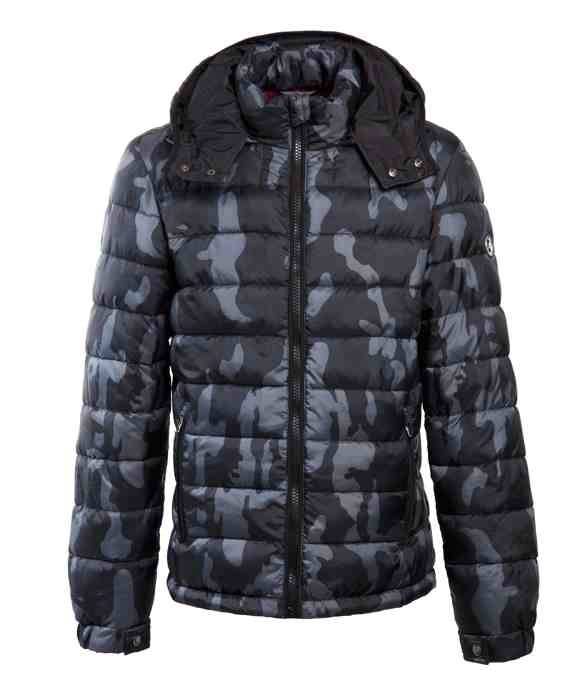 Pitti Uomo, anticipazioni della collezione autunno inverno 2013-14 di Gaudì Jeans. Piumino con cappuccio staccabile stampato fantasia camouflage, zip pressofuse nere con tirazip di metallo. Fondo e polsi elastici ,fodera interna di nylon in contrasto imbottitura in fake down patch personalizzato di panno e gommina automatici di metallo personalizzato.