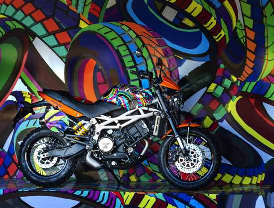 Lo spazio espositivo di PZero (Gruppo Pirelli), un edificio storico nell’area centrale della Fortezza da Basso, come tavolozza per dei viaggi fantastici. Una parete di ruote fronteggia il visitatore e si trasforma con acrobazie di colori in un murales di pop art fatto di copertoni rotolanti e fiammeggianti da cui esce una seduta anch’essa illustrata. Rifrazioni di cromie dense si appropriano di ruote, suole e calzature per essere proiettate in un mondo radioso e favoloso. A custodia del “pop wall” una motocicletta e un casco entrambi ricoperti. Impronte a colori che si ispirano al mondo Pirelli e ad una collezione, quella di PZero rappresentata al meglio da capispalla come la nuova Motocross Jacket, icona del tema guida di Pitti di questa edizione: la moto e i biker.