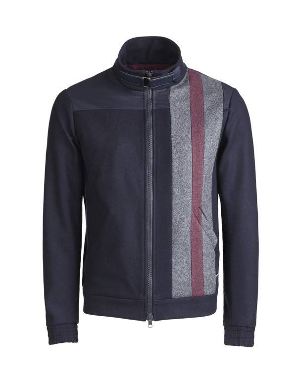(foto sopra) Ispirazione 60’s Ivy league per il giubbotto stile college in lana superleggera e dal fit cosy. Un capo casual chic nell’accostamento di toni classici navy-grigio-bordeaux