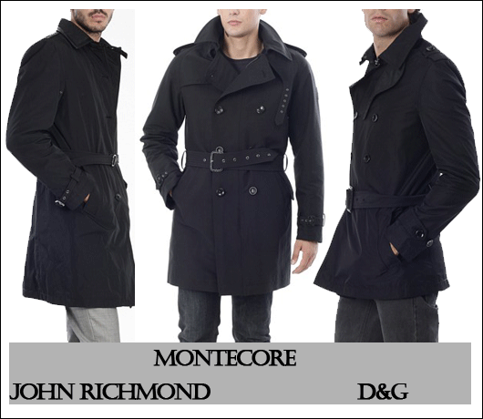Con uno stile molto casual, il trench Montecore è un modello medio lungo in tessuto tecnico, doppio petto con spalline, il cappotto John Richmond è invece in nylon con dettagli in pelle sul colletto, infine D&G propongono un modello corto in nylon doppio petto, con interno staccabile.