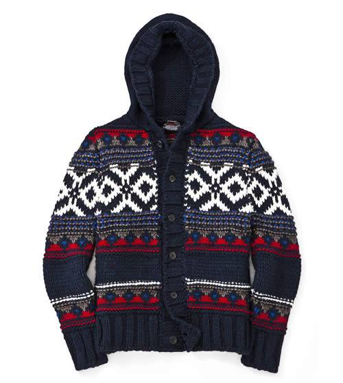 Maglie con cappuccio o shawl collars, insieme ai classici dolcevita, sono realizzate in spessa maglia di lana lavorata. Interpretazioni coloratissime dei motivi jacquard norvegesi conferiscono un nuovo twist al look per le temperature più rigide.