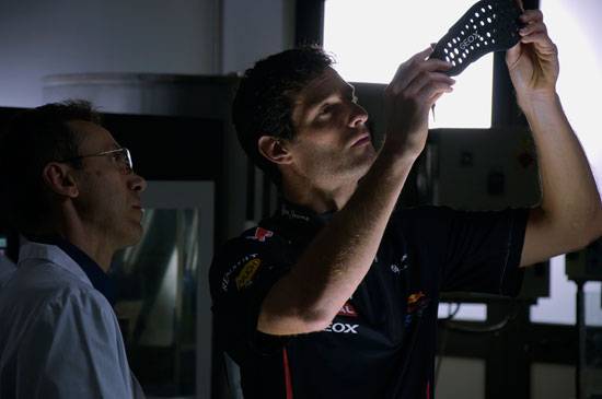 Nello spot Mark Webber è la guida di eccezione che accompagna lo spettatore dai box del Team ai laboratori Geox, dove quotidianamente vengono realizzati i test di traspirazione, impermeabilità, termoregolazione e durata per lo sviluppo di nuove tecnologie. “In Formula Uno la termoregolazione è un fattore critico: a causa di alte temperature, surriscaldamento e tensione in gara si perdono fino a 2 litri di liquidi. Geox ha sviluppato per noi nei propri laboratori la massima evoluzione del suo brevetto traspirante, che ci assicura un’ottima performance in pista”, precisa Mark Webber.