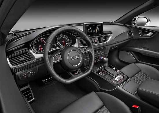 Gli interni della Audi RS 7 Sportback riprendono il design esterno e l’elegante dinamismo che lo caratterizza. L’elemento principale è il cosiddetto wrap-around, una sinuosa linea orizzonte situata sotto il parabrezza. Il cruscotto è studiato in modo da essere su misura per il conducente, la console centrale è infatti rivolta verso di lui.