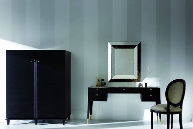 Una raffinata lavorazione a pantografo arricchisce la struttura, in pregiato rovere rigato, di tavolini, cassettiere, toilette, mobile bar e libreria. Delicati dettagli in ottone, finitura lucida o cromata, abbelliscono maniglie e piedini e donano un tocco di luminosità agli ambienti.