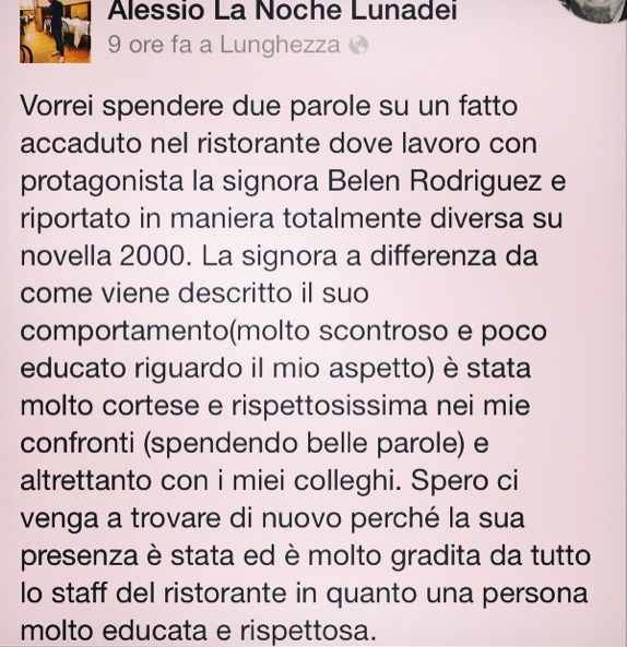 I giornali di gossip parlano e parlano e parlano. L’ultima questione riguardante Belen Rodriguez la voleva scortese e scorbutica durante una cena ad un ristorente nei confronti di Alessio, cameriere del locale. Si è detto che Belen sarebne stata davvero maleducata con il cameriere, insiando pure che fosse gay (e sinceramente in questo noi non ci troviamo niente di male !). Dopo il messaggio di lei su Facebook in merito alla questione (dove smentiva e criticava i giornali di gossip di inventarsi qualsiasi cosa), oggi arriva anche la smentita del suddetto cameriere Alessio che, su Instagram, precisa quanto segue.