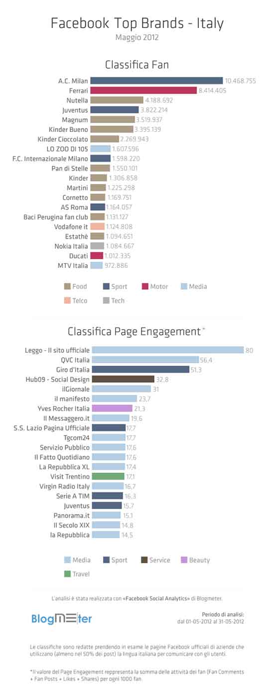 Se si considera l’aspetto della numerosità dei fan, gli italiani su Facebook hanno due grandi passioni: il calcio e i dolci. Oltre al Milan, solitario e irraggiungibile in cima al ranking, fanno il pieno di supporter club come Juventus, Inter e Roma. In vetta c’è anche il mitico “cavallino” di Maranello, seguito da una falange di aziende che sfornano prodotti golosi e accattivanti per il palato. Oltre alla citata Nutella, troviamo brand familiari come Magnum, Kinder Bueno, Kinder Cioccolato, Pan di Stelle, ancora Kinder, Martini, Cornetto Algida, Baci Perugina, Estathè. Tra i media gli unici presenti sono la trasmissione “Lo zoo di 105” e Mtv. A rappresentare la tecnologia Vodafone Italia e Nokia Italia. A maggio, rispetto al mese precedente, Blogmeter ha registrato un incremento del 12% dei fan di Mtv e della Roma e una crescita del 10% di quelli di Cornetto Algida e Magnum, segno che questo tipo di classifica è mobile oltre che influenzabile dall’investimento in banner.