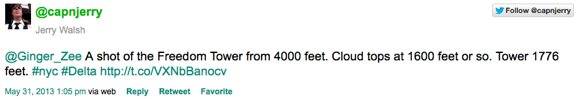 Incredibile ma vero ! Noi, purtroppo, non abbiamo potuto vederlo con i nostri occhi ma il pilota della Delta Jerry Walsh si tanto che ha fotografato questo ennesimo spettacolo dell’uomo. Il Nuovo World Trade Center, il grattacielo più alto di New York, fa capolinea tra le nuvole in un lunedi particolarmente grigio nella grande mela.Ecco il tweet del pilota: