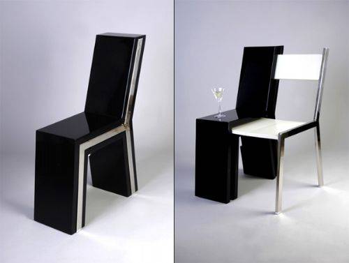 Così da risultare, da chiusa, una sedia “ristretta” poco ingombrante, utile per lo più per fungere da sgabello o ripiano; mentre da aperta – estraendo la seduta e lo schienale, più ampi e conforortevoli, dalla struttura di base – una sedia con un piano d’appoggio integrato.