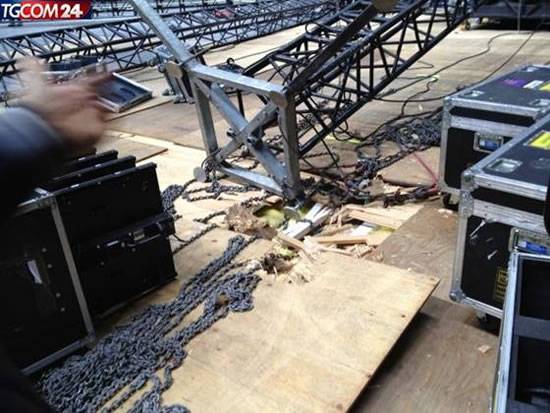 Ecco l’immagine palco del Palacalafiore, il palazzetto dello sport di Reggio Calabria che, stasera, avrebbe dovuto ospitare il concerto di Laura Pausini. Un cedimento strutturale ha fatto crollare e scivolare la struttura metallica sovrastante il palco, che si è abbattuta sulle gradinate. Nell’immagine è chiaramente visibile il punto esatto in cui il palco ha ceduto. Sarebbe stata proprio questa la causa del crollo che ha provocato la morte di un operaio romano di 31 anni, Matteo Armellini, e il ferimento lieve di altri due. Al momento, il palasport è sottoposto a sequestro da parte delle autorità giudiziarie e si sta valutando se, a causare il crollo, sia stato il cedimento del pavimento del palco stesso, evidentemente troppo fragile, o se, invece, il parquet abbia ceduto a causa dell’eccessivo peso della struttura che si stava montando.