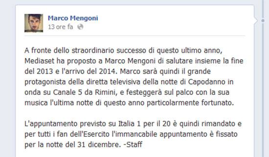 Erano anni che su canale 5, la sera del 31 Dicembre, non si vedeva uno show del genere. Tutti telespettatori, infatti potranno seguire in diretta tv il concerto che Marco Mengoni terrà in Piazza Fellini a Rimini. Mengoni esce da un anno a dir poco spettacolare sul fronte professionale: dalla vittoria a Sanremo fino ad arrivare al suo album multiplatino.