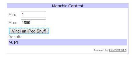 Il contest di Menchic si è chiuso il 31 dicembre scorso. 1600 in totale coloro che sono iscritti alla nostra newsletter-community (iscritti ufficiali che hanno confermato la loro iscrizione) partecipando quindi all’estrazione di un iPod Shuffle. Attraverso il sistema online random.org abbiamo estratto il numero 934 (come potete vedere nello screenshot dell’estrazione sopra)che corrisponde alla 934esima email iscritta alla nostra newsletter. Al numero 934 quindi è associata l’email del vincitore che si chiama Roberto. Complimenti a lui e grazie a tutti voi per essere stati così tanti e per continuare a leggerci così appassionatamente ogni giorno. Al prossimo contest !