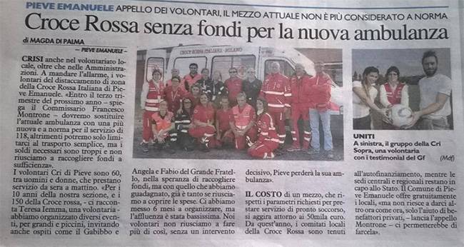 I Volontari della Croce Rossa Italiana di Pieve Emanuele devono sostituire l’attuale ambulanza con una più nuova e a norma per il servizio del 118 altrimenti si dovranno limitare solo al trasporto semplice. I soldi che servono, però, sono molti e si deve cercare di raccogliere fondi a sufficienza. Per i 10 anni della loro sezione, i 60 volontari della Cri di Pieve hanno organizzato diversi eventi per grandi e piccini e in una di queste occasioni hanno invitato anche Angela e Fabio nella speranza di raccimolare fondi.