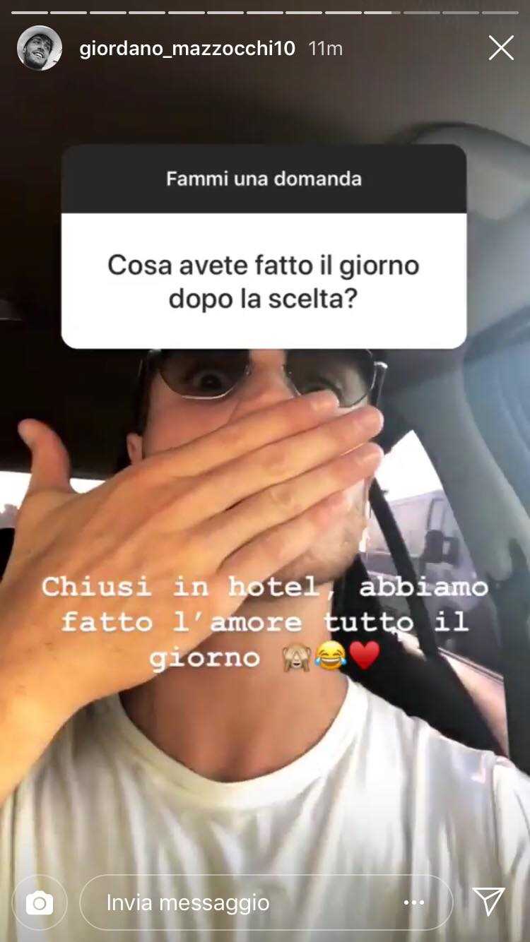 Giordano ha risposto alle domande dei suoi fan su instagram e si è soffermato su una in particolare. Cosa avete fatto subito dopo la scelta?, ha chiesto un fa di Giordano…E lui, senza peli sulla lingua ha risposto:”Ci siamo chiusi in hotel e abbiamo fatto l’amore tutto il giorno”.