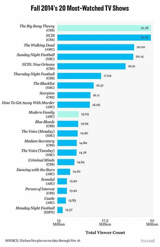 E al 1° posto si piazza con oltre 21 milioni di spettatori raggiunti, la sit-com sbanca-ascolti “The Big Bang Theory”, la cui 8° stagione inedita è attesa su Joi dal 6 gennaio. Per la cronaca, in 2° posizione è arrivata la serie procedural “NCIS” (a un’incollatura rispetto “TBBT”), mentre al 3° si colloca “The Walking Dead” (oltre 20 milioni di spettatori).