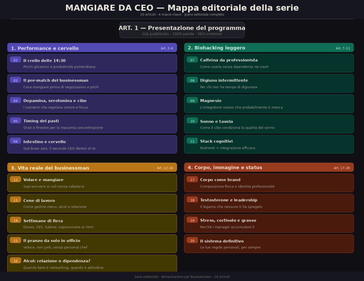 Benvenuto nella serie di 20 articoli dedicati all’alimentazione per businessmen. Non troverai qui tabelle caloriche, sermoni sul colesterolo o ricette detox. Troverai quello che funziona davvero quando hai tre call di fila, un volo alle 7 e una cena di lavoro la sera.