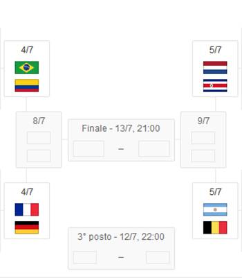 Mondiali 2014, ecco le squadre che si affronteranno venerdi 4 Luglio. Argentina-Belgio alle ore 18 su Sky e Olanda-Costa Rica alle 22 su Raiuno e Sky. Due partite mozzofiato..chi accederà alla semifinale?