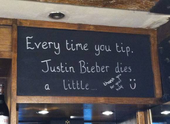 Sarà anche l’idolo di milioni di ragazzine ma per alcuni londinesi non è certo nè una pop star nè tanto meno un “amicone”. Stiamo parlando del giovanissimo Justin Bieber che a Londra, e precisamente a Camden town, non sembra essere molto gradito. La foto che vi facciamo vedere l’abbiamo scattata proprio dentro ad un pub di Camden town, duranto il nostro week-end nella città inglese. …Che Justin Bieber non fosse proprio amatissimo da tutti questo lo avevamo già capito ma una roba del genere non si era mai vista ! Ironica e cinica, la scritta sopra la lavagna di questo pub londinese non lascia fraintendere proprio niente: “Every time you tip, Justin Bieber dies a little“. Traduzione: ogni volta che lasci una mancia Justin Bieber, muore un pochino. E poi i ringraziamenti per l’aiuto che i clienti vorranno dare…