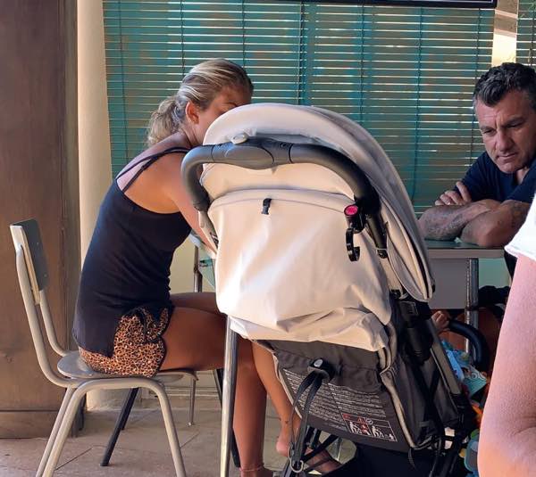 Anche noi siamo a Formentera quest’anno e li abbiamo beccati tutti insieme a fare colazione al Cafè Miranda a Es Pujol. Come potete vedere dalla foto sotto, Costanza è molto attenta alla piccola e dopo aver dato un’occhiata al telefono cerca di sistemare iol passeggino della piccola per farla stare più comoda.