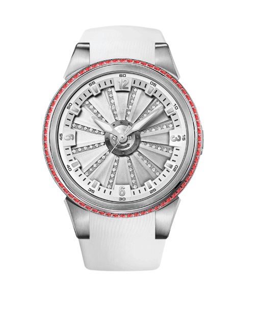 Due modelli di colore rosso ciliegia rappresentano l’eccezione alla regola, con la loro lunetta rivestita di rubini taglio brillante e la turbina bianca abbinata al cinturino oppure con una lunetta rivestita di rubini taglio baguette, turbina bianca e cinturino rosso.