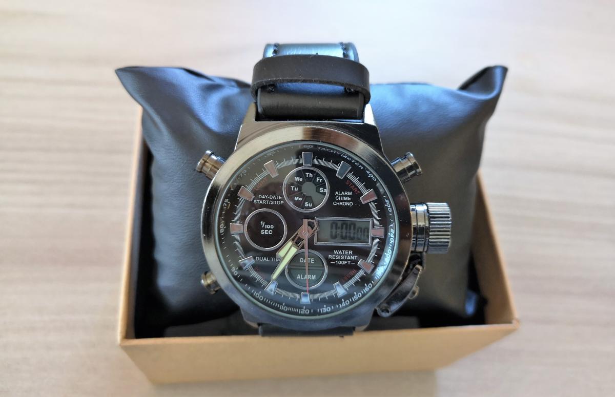 La scocca è fatta completamente in metallo anti corrosione e resistente all’acqua fino a 30 metri di profondità. Il quadrante ha la possibilità di far leggere l’orario sia tramite le lancette che in digitale. É dotato di cronometro, sveglia e calendario per poter tenere tutto sotto controllo. Può resistere agli agenti atmosferici ed ai graffi. Dispone di cinturini intercambiabili disponibili nel modello in pelle ed in stoffa.