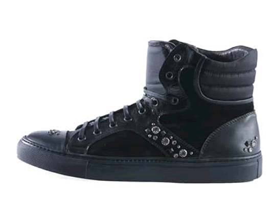 Daniele Alessandrini propone per questo autunno inverno 2010 le sneaker alte. Le sneaker alte di Alessandrini sono in suede nero con profili in vernice. Queste sneaker sono un’elegante alternativa alla classica scarpa maschile.