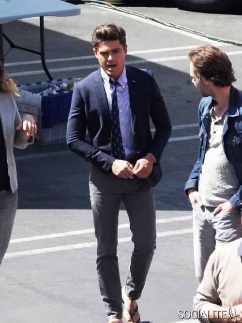 Look Chic, Zac Efron sul set in cravatta e infradito