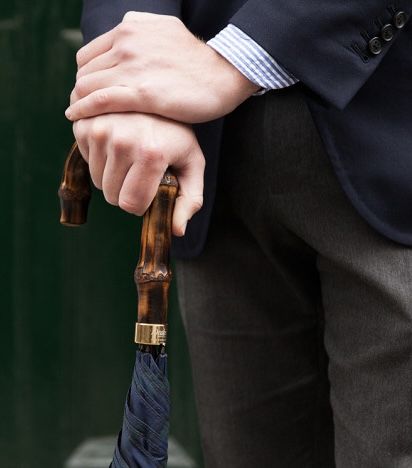 È il re assoluto del formalwear maschile. Lungo circa 90-95 cm, con manico ricurvo in legno o corno, è l’ombrello tradizionale inglese per eccellenza. Il modello classico non si apre: si porta arrotolato, tenuto verticale come un bastone, e si spiega solo in caso di pioggia intensa. Questo dettaglio è fondamentale: chi porta un ombrello da city arrotolato anche sotto la pioggia leggera dimostra una padronanza del codice estetico che pochi possiedono. Abbinamento ideale: completo scuro (navy o charcoal), camicia bianca, cravatta in seta. Contesto: riunioni formali, eventi istituzionali, ambienti finanziari.