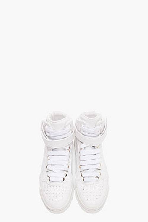 Leggi tuttoGivenchy propone per la linea maschile queste sneakers high-top in pelle bianca con tanto di cinturino in bella vista. All