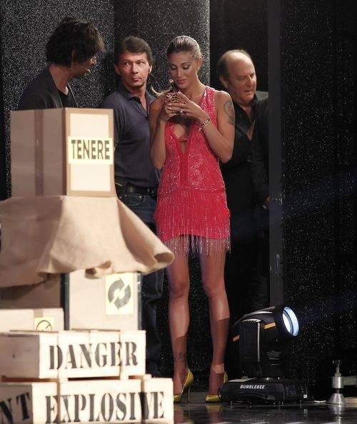 Leggi tuttoMelissa Satta ha scelto di indossare un abito lungo Roberto Cavalli ed una borsa da sera Just Cavalli in occasione