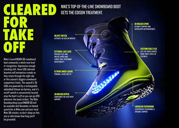 Leggi tuttoNike Snowboarding presenta il più tecnologicamente avanzato dei suoi boots da snowboard: Nike LunarENDOR. Racchiusi nello swoosh, i 30 led